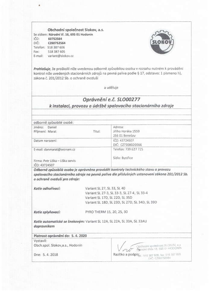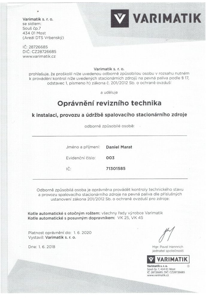 Provádíme revize kotlů na pevná paliva dle zákona o ochraně ovzduší. Po provedené revizi Vám bude vystaven protokol dle příslušného zákona a zaslán na Vaši adresu.